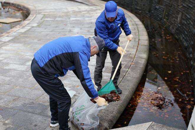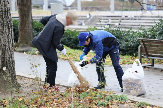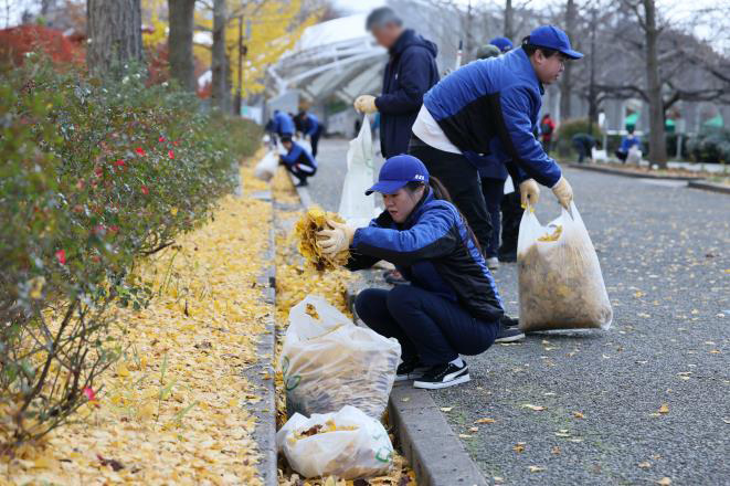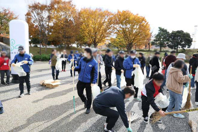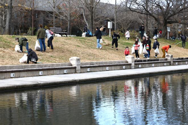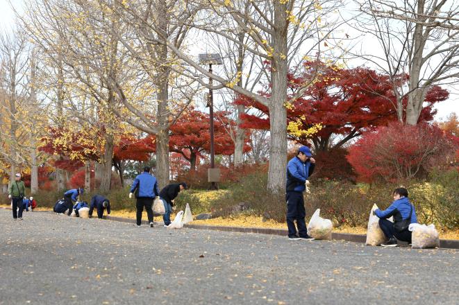 今回の活動には160人が参加。参加者は新潟県スポーツ公園のカナール周辺に広がり、手分けをして桜やイチョウの落ち葉を集めました。前日まで天候が悪かったため、落ち葉が濡れていて作業も一苦労でしたが、約50分の作業で公園内をきれいにすることが出来ました。