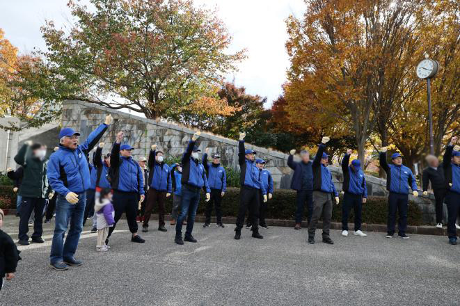 良い天候に恵まれて、開始前に全員でTeam ECO 体操で体をほぐし作業に入り、手分けをして桜やイチョウの落ち葉を集めました。