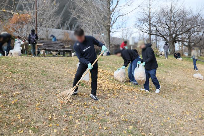 今回の活動には160人が参加。参加者は新潟県スポーツ公園のカナール周辺に広がり、手分けをして桜やイチョウの落ち葉を集めました。前日まで天候が悪かったため、落ち葉が濡れていて作業も一苦労でしたが、約50分の作業で公園内をきれいにすることが出来ました。